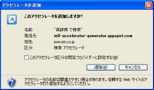 用途があるかは謎ですが、なんとなく作ってみました。 http://ie8-accelerator-generator.appspot.com/ これを使うと、簡単にIE8のアクセラレータ(のXML)が作成でき、インストールできます。 ■ 使い方 最低限入力する必要のある項目は2つだけ。 「アクセラ…
